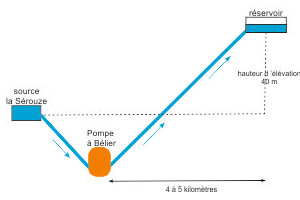 le bélier hydraulique était la solution au problème : ce système a été a été inventé en 1797 par Joseph-Michel Montgolfier (celui qui a construit la première montgolfière en 1782 !)