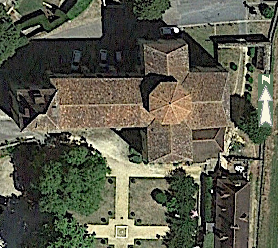 Sur cette vue aérienne (Google Earth), on remarque sa forme en croix latine : la grande branche de la croix va du clocher-porche situé à l'ouest , parcourt la nef et se prolonge jusqu'au choeur, dirigé vers l'est, direction de Jérusalem comme c'était l'usage à l'époque médiévale (environ 45 m de long).