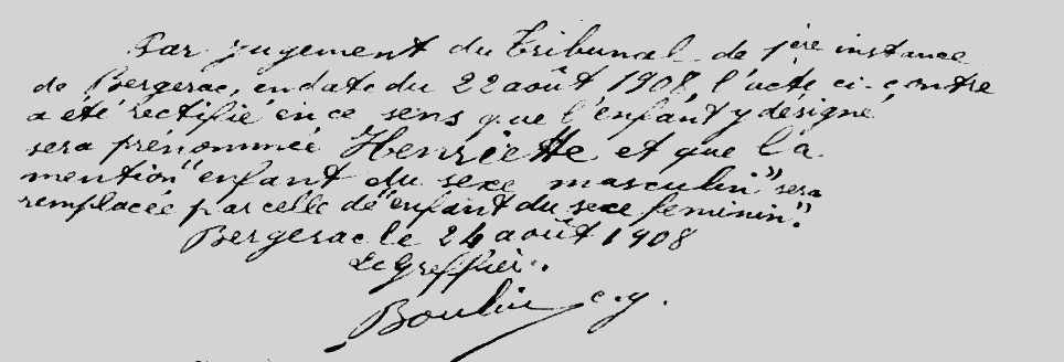 du Tribunal civil de Bergerac . Ce jugement intervint le 22 août 1908 et elle put se marier le 22 septembre à Sainte Foy de Longas .