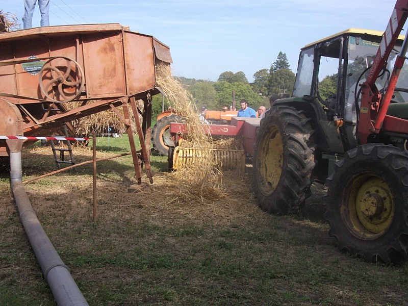 Les hommes s'activent : le gros tracteur qui va fournir l'énergie toussote déjà derrière l'antique batteuse Merlin 1949. La batteuse est actionnée au moyen de poulies et courroies par la prise force du tracteur et on peut remarquer les longues courroies plates qui sont croisées pour obtenir le bon sens de rotation pour chaque élément de la machine.