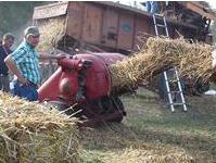 Les liens qui tiennent les gerbes sont rapidement coupés et elles sont insérées dans l'engreneur automatique situé sur le dessus de la batteuse. Spécialement conçu, il permet "d'avaler" les gerbes sans risque de "bourrage" ... Le batteur cylindrique tournant éclate les épis qui doivent ressortir vides. Il faut régler avec soin le batteur pour que les grains ne soient pas cassés. La paille, les grains et balle tombent sur des secoueurs, les grains passent à travers un crible pour les séparer de la paille.
